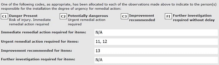 - Code 2 (C2): Potentially dangerous. Urgent remedial action required. These installations must also be made safe as soon as possible